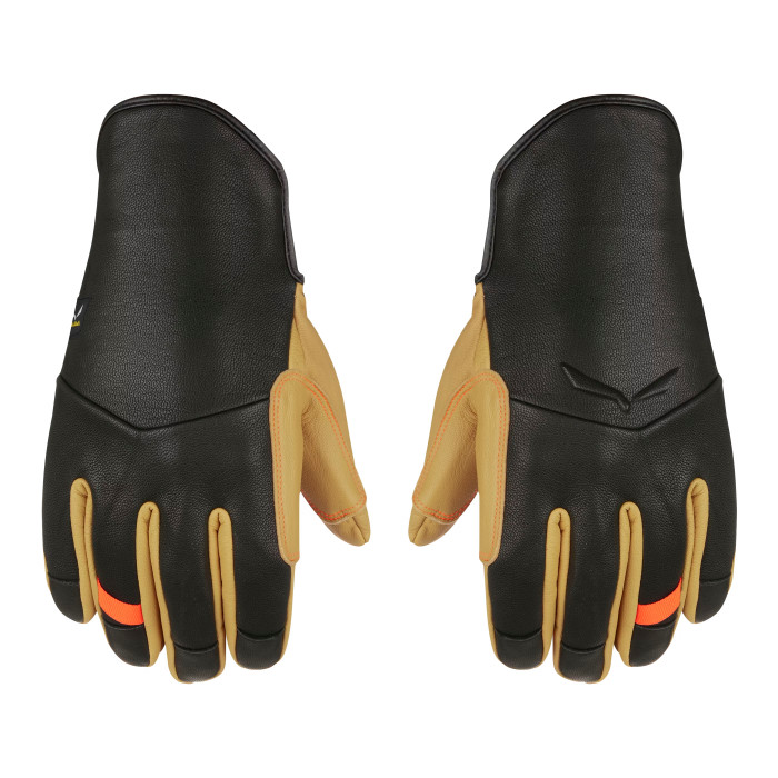The goatskin leather, 3-D thumb and anatomically pre-shaped, slim cut fingers ensure good grip and dexterity for tools, ski poles and protection, while the neoprene cuff with Velcro closure keeps the heat in and seals the elements out. With pull-on tabs for easy entry, a wrist leash and carabiner loops to secure them to your harness or pack when not in use.